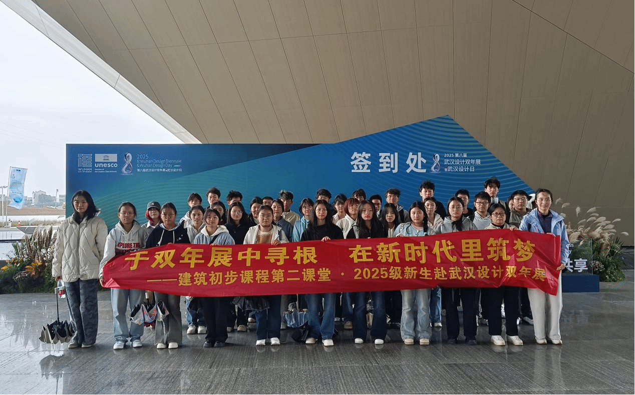 为拓展新生专业视野,强化专业认同感,11月9日,我院组织2025级建筑学系全体新生前往以“创意无界,融合共享”为主题的2025年武汉双年展,开展了一场别开生面的《建筑初步》课程实践。活动由欧阳红玉、黄雪峰、朱嘉欣等骨干教师带队,为同学们开启了专业学习的“第二课堂”。