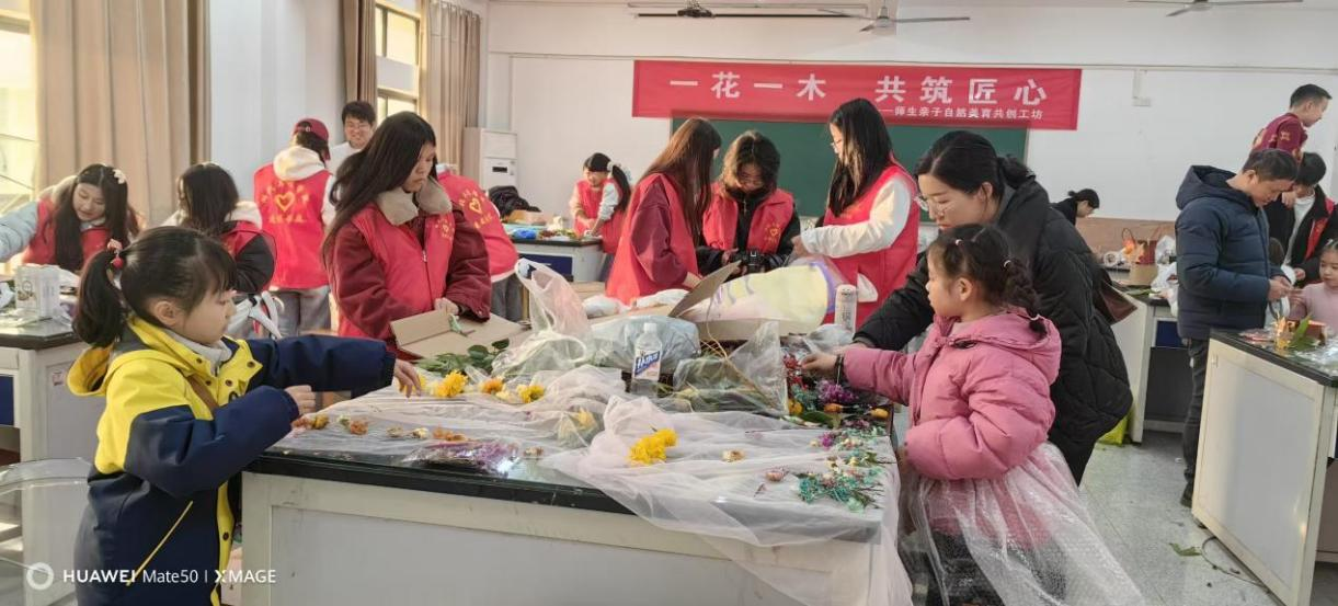 在工会的协调与各党支部的积极推动下,师生们齐聚明德楼梧桐树下,共同收集落叶、枯枝等自然素材。随后,大家移步天成楼415教室,在支部党员教师与学生志愿者的专业指导下,亲子共同动手,将自然材料转化为精美的手工饰品。现场氛围温馨融洽,充分展现了党支部的服务引领作用和工会联系群众的纽带功能。