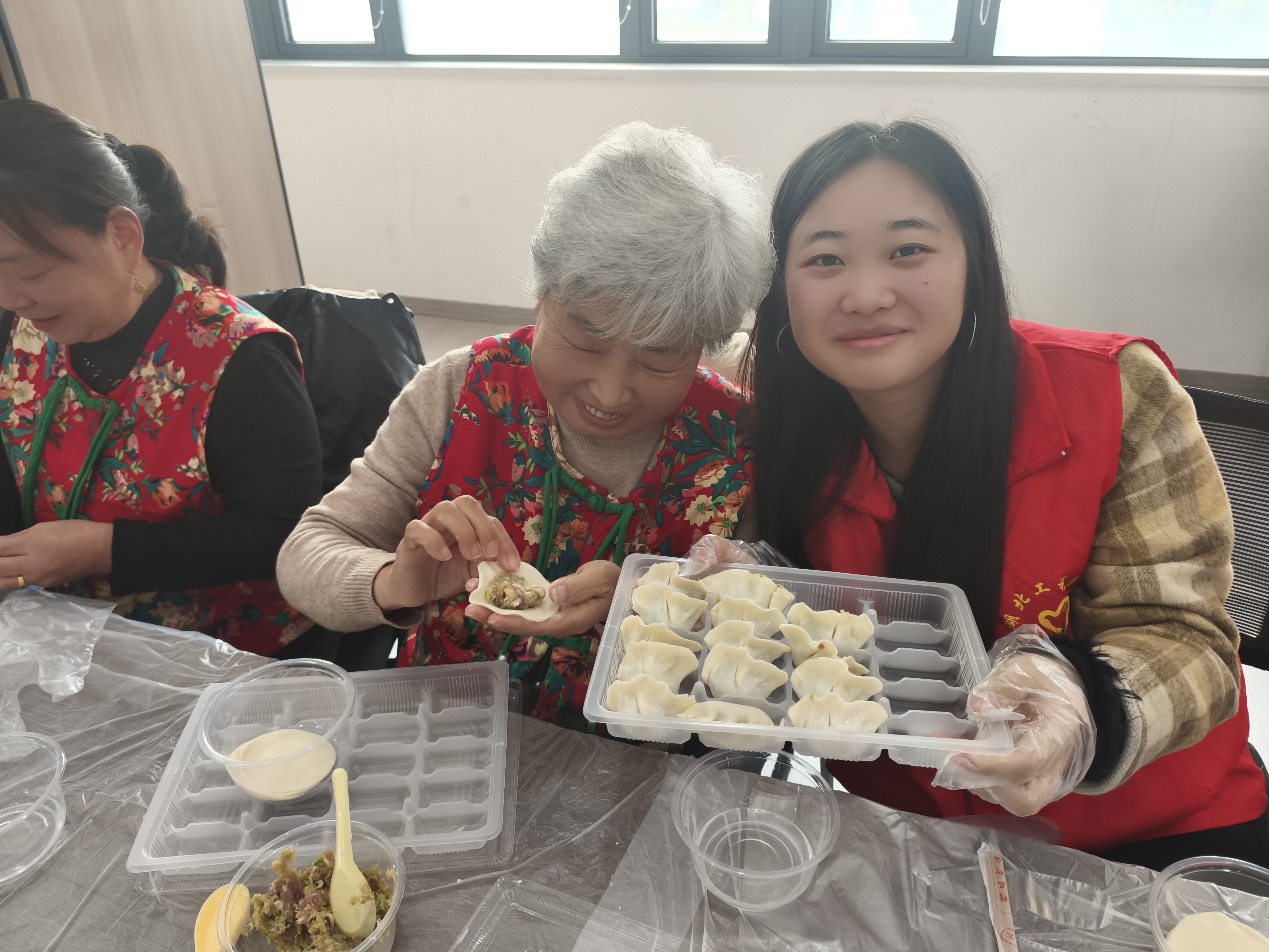 活动在热闹的“击鼓传花”游戏中拉开序幕,社区的爷爷奶奶们与学生志愿者相继表演舞蹈、歌曲,现场掌声与欢笑声不断。随后的包饺子环节中,学生志愿者们在社区爷爷奶奶的细心指导下逐渐熟练,形态各异的饺子渐渐摆满餐盘。大家一边包饺子,一边聆听长辈讲述冬至习俗,温馨互动犹如家人团聚。