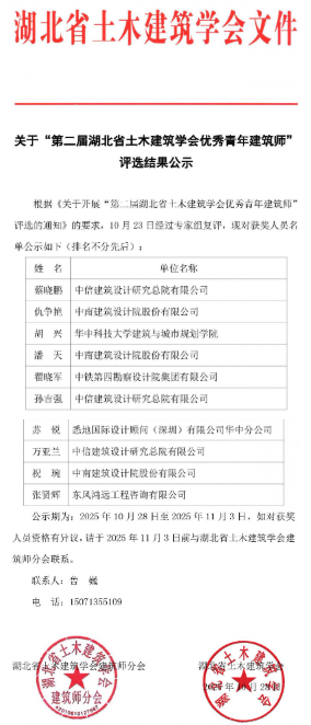 据悉,本次评选旨在表彰在建筑设计与创作实践中做出重要贡献与突出业绩的青年设计人才,评审过程极为严格。经过资格初审、专业评审与综合评定等多轮环节,张贤辉校友凭借其卓越的专业能力和突出的行业贡献,最终成为本届评选产生的十位优秀青年建筑师之一。尤为难得的是,他是本届获奖者中唯一一位来自地市州的建筑师,同时也是其供职的东风鸿远工程咨询有限公司建院43年以来,首位获此省级殊荣的建筑师,实现了个人与企业的历史性突破。